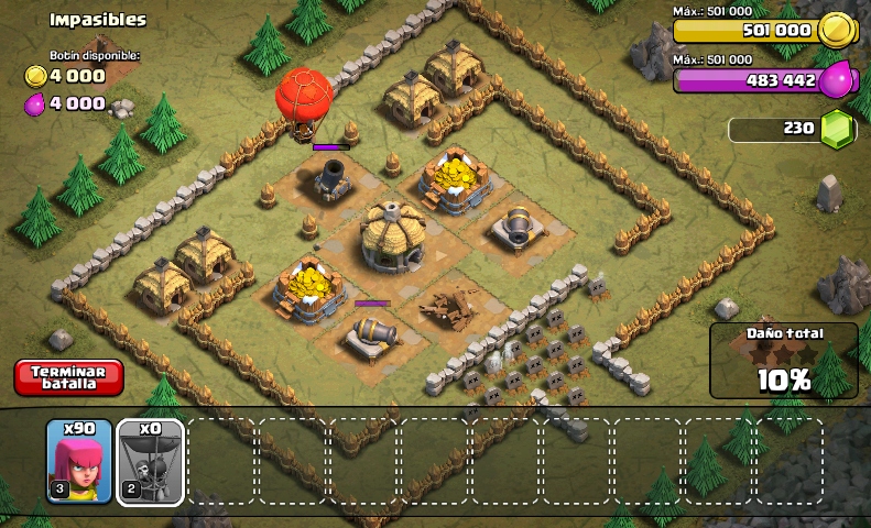 Después lo he vuelto a hacer con cinco arqueras de nivel 6. Se han cargado el cañón y han quedado tres con vida. Por cierto, puntazo el de la flecha azul en la foto, que da de lujo.